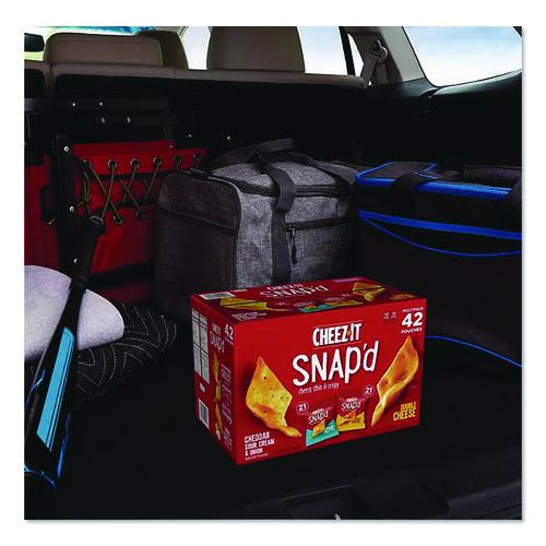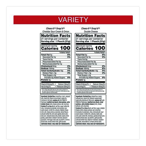Cheez-It Snap'd snacks are perfect for celebrating game time, make a great addition to party spreads, cure late-night savory cravings and more—the cheesy options are endless. Pack your Snap'd snacks in school lunches or as an extra snack for on the go. With double the cheesy zest for double the flavor and double the fun, this snack will tempt you with "just one more bite." You'll love the bold crunch and delicious, tasty flavor of real cheese in every perfectly baked bite of Cheez-It Snap'd Cheesy Baked Snacks. With 100% real cheese baked in and sprinkled on top, Cheez-It Snap'd crackers are irresistibly cheesy. Includes two exciting flavors: Cheddar Sour Cream and Onion and Double Cheese.Package Includes: (21) Cheddar Sour Cream & Onion; (21) Double CheeseNote: This is a non-returnable item.