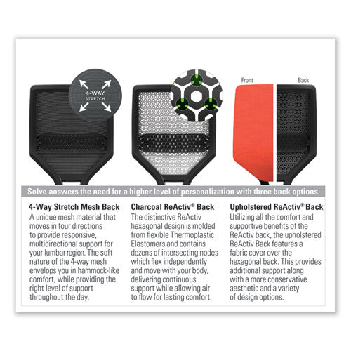 The synchronized seat and back move in harmony with the user to provide continuous comfort. Seat glide adjustment moves the seat cushion forward or back to adapt to upper leg length. Waterfall seat edge promotes leg circulation. Height- and width-adjustable arms for upper body support. The ReActiv hexagonal design is molded from flexible thermoplastic elastomers and contains dozens of intersecting nodes which flex independently and move with your body, delivering continuous support while allowing air to flow for lasting comfort.