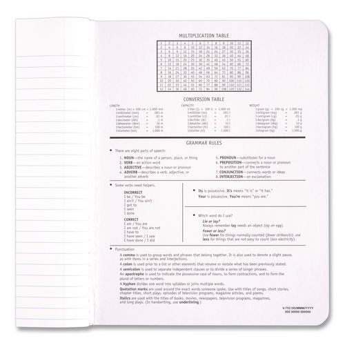 Durable black marble cover with modern nameplate and secure sewn binding. Class schedule grid on inside front cover. Multiplication table, conversion table and grammar rules on inside back cover.