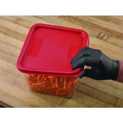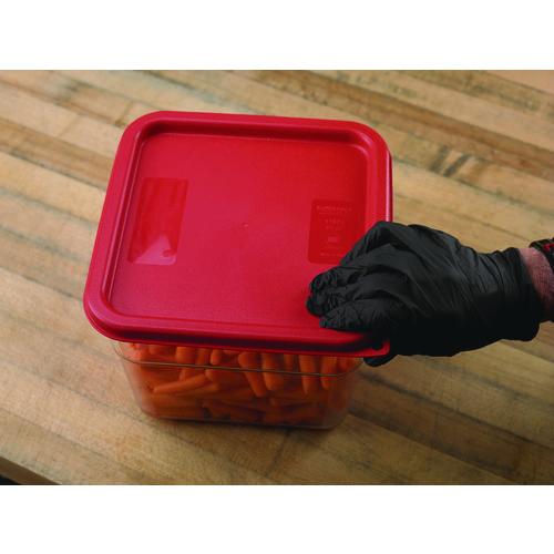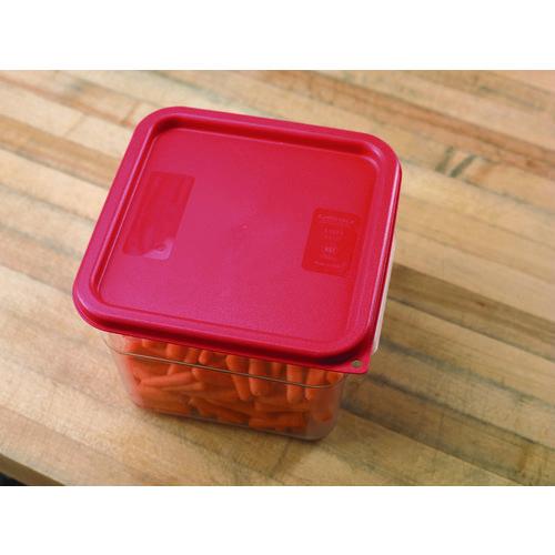 Tight fitting, color-coded lids for food storage containers encourage organization and reduce cross-contamination. They snap firmly to square tops, keeping contents fresh and away from environmental contaminants. They also feature a hanging hole that facilitates sanitary storage and fast drying.