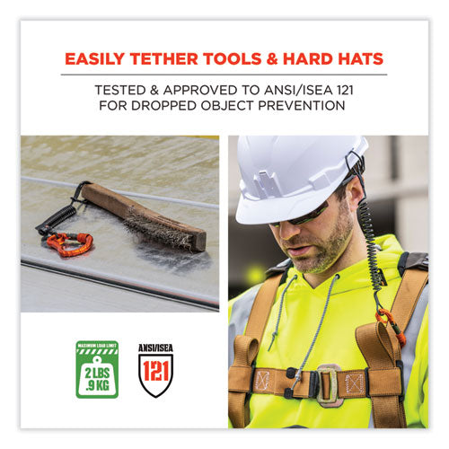 The Squids 3156 Coiled Tool Lanyard with Carabiner securely tethers hand tools, hard hats and other small gear to prevent them from becoming dangerous dropped object hazards while working at heights. The low-profile coiled design helps reduce the potential for snag and tangle hazards; and thanks to its manual locking screw gate aluminum carabiner on one end and a flexible tethering loop on the other, this versatile system provides a variety of options for getting a secure connection to anchor points, a tool's captive hole eyelets, retrofitted tool-attachment points and hard-hat accessory slots. Tested to be trusted and built to withstand harsh conditions, this lanyard is third-party certified to a maximum working capacity of 2 lb with a 2:1 safety factor.Note: This is a non-returnable item.