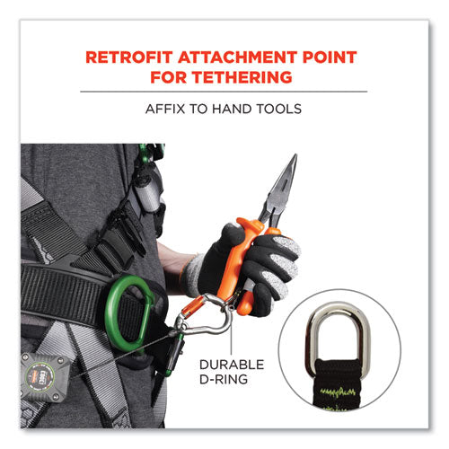Squids 3700 Nylon Webbing Tool Tails make it easy to retrofit smaller hand tools for tool-lanyard tethering. Heavy-duty nylon webbing is double-stitched with high-tensile-strength nylon thread to ensure reliable performance in even the harshest work environments. A corrosion-resistant, stainless-steel D-ring on one end accommodates tool-lanyard connections. When combined with Squids 3775 Self-Adhering Tool Traps (traps sold-separately), a flat tool-tethering length on the other end accommodates tool-handle attachments. Simply lay the tail's tool-tethering length along your tool handle's length and wrap. These tool-lanyard tails are built to withstand defined weight limits and can easily be used by any worker to help avoid accidentally dropping objects that could cause extensive property damage and serious, potentially deadly injuries. When used properly, these tails feature a maximum safe working capacity of 2 lb with a 2:1 safety factor.Note: This is a non-returnable item.