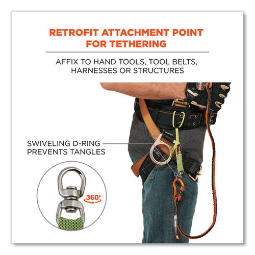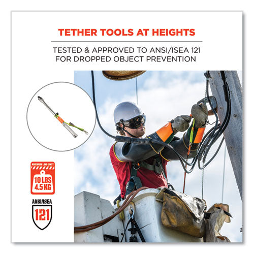 Squids 3713 Elastic Loop Tool Tails with Two-Piece Swiveling D-Rings act as a handy retrofit attachment point for a wide variety of tools, to minimize the potential for dangerously dropped objects when working at heights. Heavy-duty nylon webbing is double-stitched with high-tensile-strength nylon thread to ensure reliable performance in even the harshest work environments. Built for versatility and secure, always reliable tool tethering, these tails feature a stretchable nylon loop with an adjustable barrel lock on one end and a corrosion-resistant, two-piece swiveling D-ring on the other. Once the loop end of the tail is secured to a tool or anchor point, the D-ring acts as a captive hole for hassle-free tool-lanyard attachments. By allowing for seamless rotation, the swiveling mechanism helps prevent the overall tool-tethering system from getting tangled or bound up. For best results, always reinforce the loop end of the tool tail with Squids 3775 Self-Adhering Tool Traps or Squids Cold-Shrink Tool Traps (tool traps sold separately). When working at heights, it's essential to tether your tools, and these tool tails are built to withstand defined weight limits and can easily be used by any worker to help avoid accidentally dropping objects that could cause extensive property damage and serious, potentially deadly injuries. When used properly, Squids 3713 Elastic Loop Tool Tails are third-party certified to a maximum tethering capacity of 10 lb with a 2:1 safety factor.Note: This is a non-returnable item.
