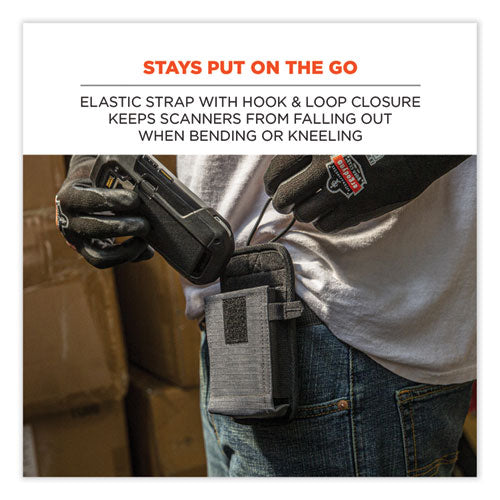 The Squids® 5542 Phone Style Barcode Scanner Holster with Belt Loop prevents costly drops or losses by keeping handle-less barcode scanners, mobile computers and even cell phones securely stored and conveniently accessible. With an easy-to-attach belt loop, the holster slides over and secures around belts without having to remove them. Unlike standard belt clips, the loop design also makes it possible to securely attach scanners to carts, equipment or fixtures. Built with abrasion-resistant ripstop polyester for work in the harshest environments, plus a fleece lining for protection from scratches. This barcode scanner holster is designed for convenient use with candy bar style scanners that do not have a handle. An elastic strap with hook-and-loop closure plus snug elastic sides ensure devices remain securely stored whether the holster is worn vertically or horizontally.Note: This is a non-returnable item.