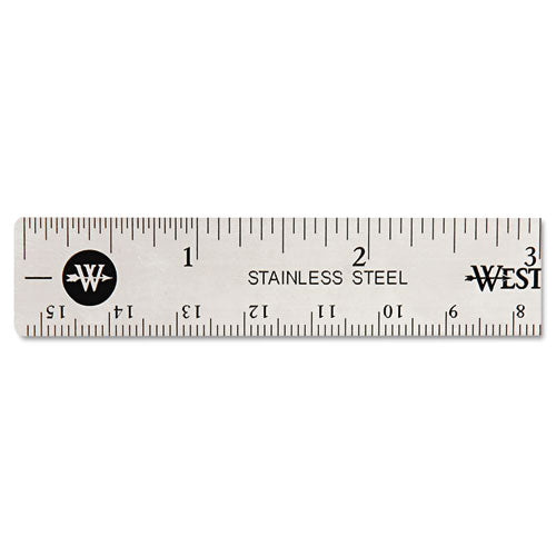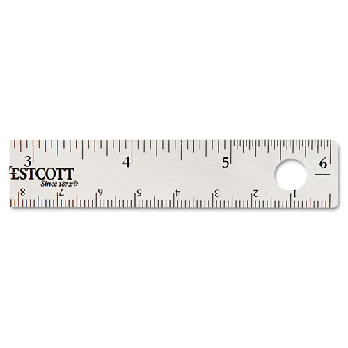 Nearly indestructible, warp-free, bend-resistant stainless steel ruler is ideal for precision tasks. Nonslip cork backing helps ensure precise measurements. Attractive, bright and tasteful, metallic finish fits right into modern office environments. Etched, bright white standard and metric markings deliver easy readability. First and last inches feature 1/32" gradations. Drilled hook hole on one end for convenient tool-board storage.