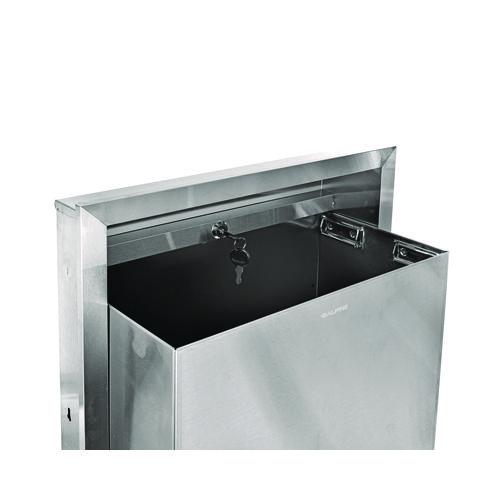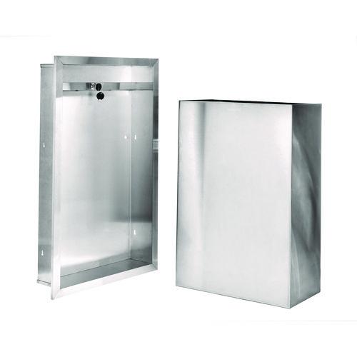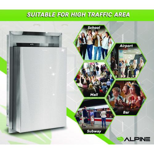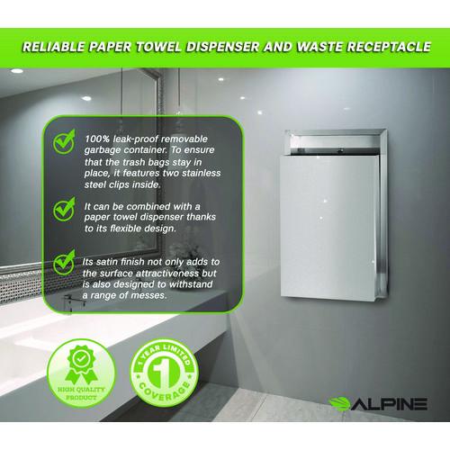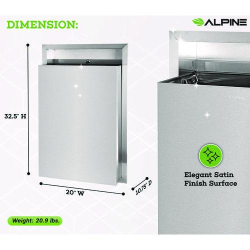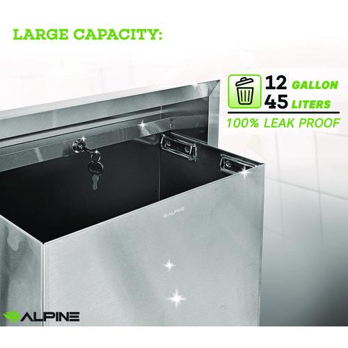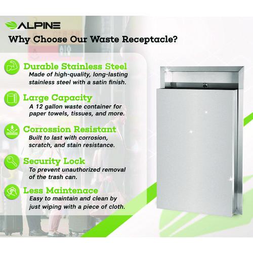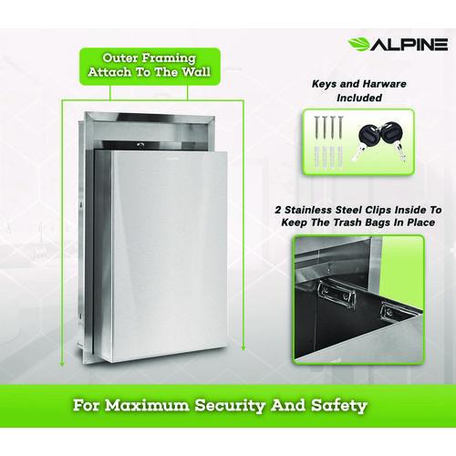 You will have absolutely no issues when it comes to saving space and ensuring impeccable waste management in your facility with the Alpine Industries Stainless Steel Recessed Waste Receptacle. This waste receptacle is expertly crafted from high-quality stainless steel material, featuring a beautiful satin finish that adds a touch of elegance to any setting. The design includes a seamless beveled flange, which not only enhances its aesthetic appeal but also ensures a smooth and safe edge that minimizes the risk of accidental injuries. Additionally, the receptacle comes with a removable container that securely locks into the recessed cabinet. This feature not only makes waste disposal efficient but also simplifies the process of cleaning and maintenance, as the container can be easily detached and reattached as needed. Furthermore, the recessed design of the receptacle allows it to integrate seamlessly into the wall, optimizing space and maintaining a clean, uncluttered appearance. This makes it an ideal choice for facilities where both functionality and style are paramount. With the Alpine Industries Stainless Steel Recessed Waste Receptacle, you can confidently maintain a spick-and-span environment while maximizing space efficiency and adding a sophisticated touch to your facility.Package Includes: Mounting Hardware; KeysNote: This is a non-returnable item.