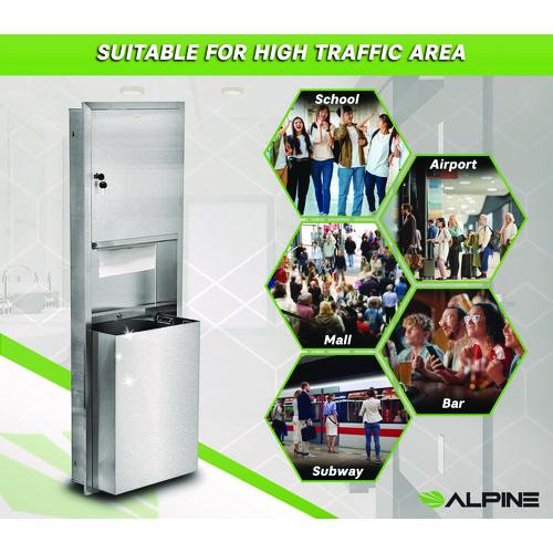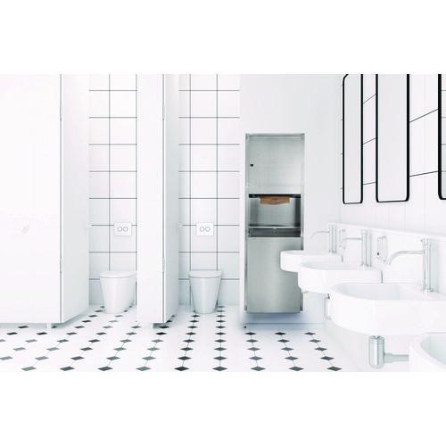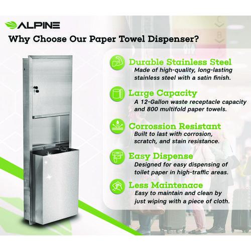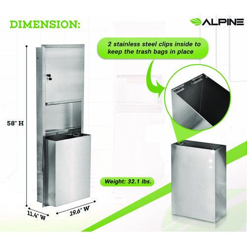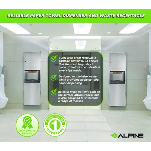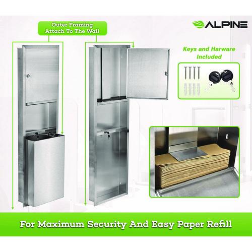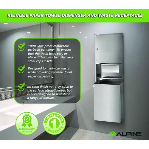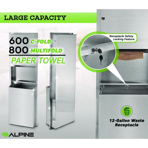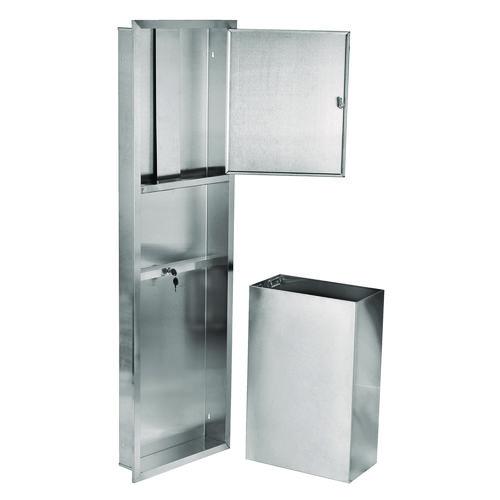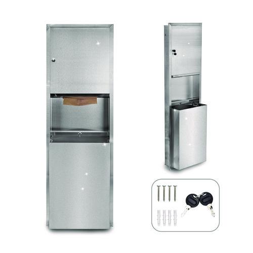 Our Recessed Paper Towel Dispenser and Waste Receptacle is made from long-lasting, heavy gauge stainless steel with a smooth satin finish. With our self-feeding, rounded hemmed opening, paper towels dispense without tearing, limiting waste. The paper towel tray can hold 600 C-Fold or 800 Multifold paper towels. Our waste receptacle features an ample sized leakproof 12-gallon waste container that is ideal for high traffic areas such as public bathrooms. Inside the wastebasket is two stainless steel clips to ensure the trash bag is secure throughout the day. Each door is furnished with a tumbler lock key to prevent any unauthorized access.Note: This is a non-returnable item.