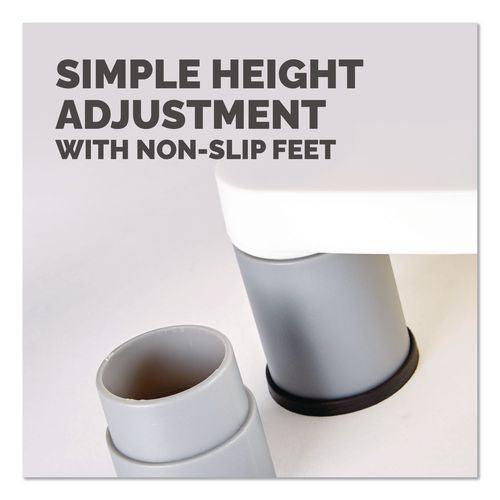 Innovative stacking columns raise monitor to eye level to help prevent neck strain. Features three different height adjustments from 2" to 4". Designed to support monitors up to 60 lbs. Includes convenient cord management. Non-skid rubber foot rings for stability.