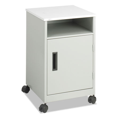 Sleek design fits neatly into smaller areas. Steel stand has a durable powder coat finish and a scratch resistant laminate top. Single-door enclosed cabinet for supply storage and fixed interior shelf. Open area under top for frequently accessed materials. Storage pocket inside door for manuals. Mobile on four casters (two locking).Note: This is a non-returnable item.