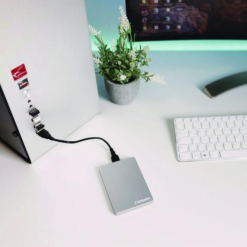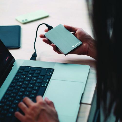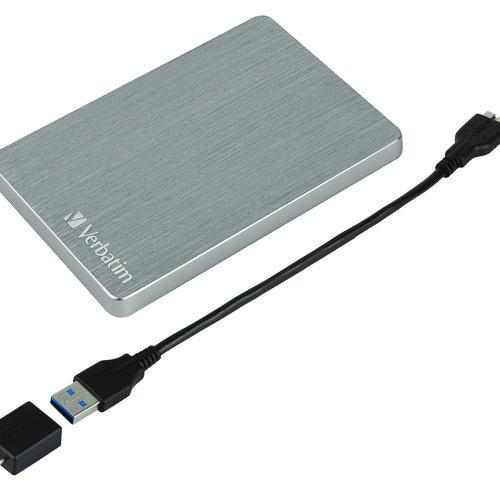 The sleek brushed aluminum 1TB Store n' Go ALU Slim Portable Hard Drive brings a look ofsophistication to any Mac or PC and has a USB 3.2 Gen 1 connection for data transferspeeds of up to 5 Gbps. The Store n' Go Portable Hard Drive comes pre-installed with Nerobackup software for full system backup and restore functionality schedule automaticbackups by date and time, or encrypted backup with password protection. With the high speed and high capacity of the stylish Store 'n' Go ALU Slim, you can store and carry your digital life with you, wherever you go.Package Includes: Green Button Energy-Saving Software; Micro-B to USB-A Cable; Multilingual Quick Start Guide; Nero Backup Software (only compatible with Windows OS); USB-A to USB-CTM Adapter; User Manual (preloaded); Verbatim Hard Drive Formatter Software