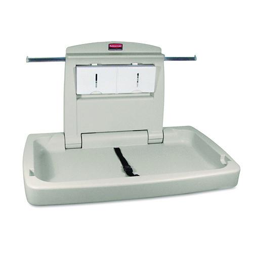 The Rubbermaid Commercial Horizontal Baby Changing Station is designed for commercial environments. Built from high-density polypropylene, this baby changing pad table does not absorb moisture. This baby station meets all global EN, FDA, ADA, and ASTM safety standards. The sturdy station features an accessory shelf to keep items away from baby plus easy reach hooks. The smooth surface makes this changing table easy to clean. Constructed from study materials for durability and antimicrobial product protection.