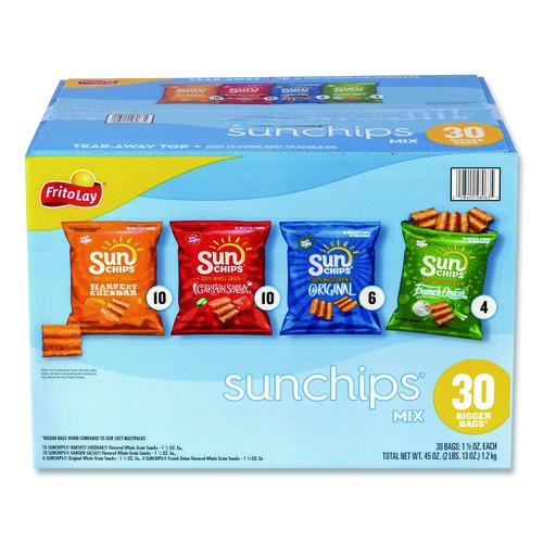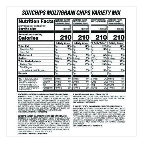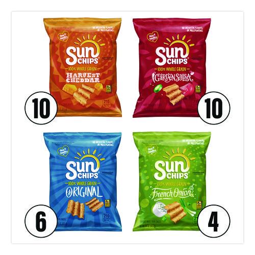 Bite into the tough, delicious flavor of Jack Link's Beef Jerky in Original and Teriyaki flavors! Or grab a bag of Sunchips in Harvest Cheddar, Garden Salsa. Original and French Onion flavors!Package Includes: (30) 1.5 oz Bags Sunchips: (10) Harvest Cheddar®; (10) Garden Salsa®; (6) Original; (4) French Onion; (9) 1.25 oz Jack Link's Beef Jerky Snack Packs: (5) Original; (4) TeriyakiNote: This is a non-returnable item.