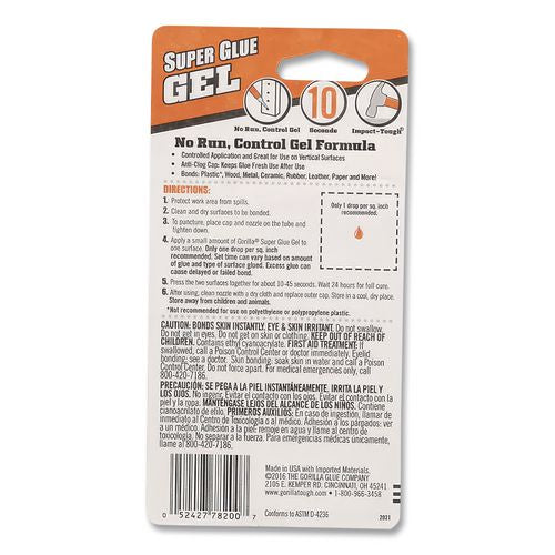 Gorilla® Super Glue Gel is an easy-to-use, thicker and more controlled formula great for multiple surfaces and vertical applications. Impact tough and reinforced to increase impact resistance and strength. Anti-clog cap keeps glue from drying out. Versatile and bonds plastic, wood, metal, ceramic, rubber, leather, paper and more. Fast setting and dries in 10-45 seconds with no clamping required.
