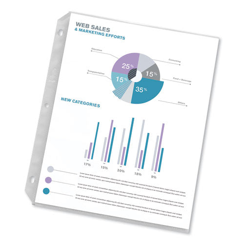 Protection of your important papers is one area where you shouldn't hesitate to throw your weight around. These Heavyweight and Super Heavyweight Sheet Protectors are super convenient, storing up to 10 sheets of 8 1/2" x 11" paper in each page. The Easy Load feature delivers a wider top opening, allowing you to slide pages into place quickly and easily. Non-glare material reduces distracting glare and is acid-free and archival safe to keep print on your papers where it belongs, rather than sticking to the plastic. With these dependable sheet protectors, your work will be strong and solid.