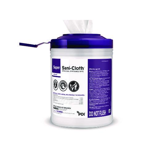Super Sani-Cloth germicidal disposable wipes are proven effective against enveloped and non-enveloped viruses, fungi, bacteria, multidrug-resistant bacteria and blood-borne pathogens—32 microorganisms in all, including SARS-CoV-2. A fast contact time of just two minutes accommodates quick room turnovers, making them ideal for daily use in fast-paced environments that require short contact times and broad microorganism coverage. Thick and strong with a high fluid capacity, each wipe is also pliable enough to get into tight crevices and corners. Safe for use on a broad range of health-care equipment and most hard, nonporous surfaces. Active ingredient: isopropyl alcohol 55.5%.Note: This is a non-returnable item.