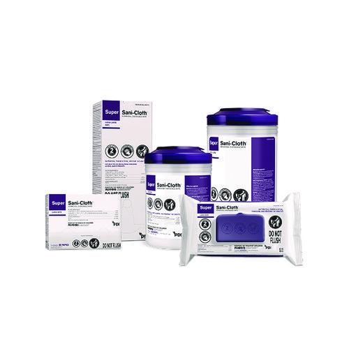 Super Sani-Cloth germicidal disposable wipes are proven effective against enveloped and non-enveloped viruses, fungi, bacteria, multidrug-resistant bacteria and blood-borne pathogens—32 microorganisms in all, including SARS-CoV-2. A fast contact time of just two minutes accommodates quick room turnovers, making them ideal for daily use in fast-paced environments that require short contact times and broad microorganism coverage. Thick and strong with a high fluid capacity, each wipe is also pliable enough to get into tight crevices and corners. Safe for use on a broad range of health-care equipment and most hard, nonporous surfaces. Active ingredient: isopropyl alcohol 55.5%.