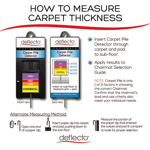 The SuperMat® chair mat is a versatile choice for frequent use on carpets up to 1/2" thick and is well-suited for a variety of commercial and home office applications. Easy-glide rolling surface provides smooth chair movement to help minimize stress and strain on users back, legs and feet. Bottom studs grip the carpet securely and keeps the chair mat from moving. Deflecto's Free and Clear® non-orthophthalate, non-cadmium formula promotes a healthy work environment.