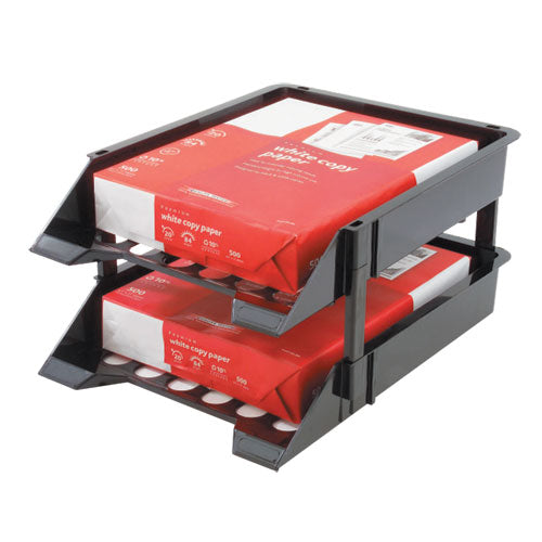 Bring order to your office and collect all important files and documents in one place, or simply keep paper supplies within reach! The SuperTray® Countertop Tray is lightweight, yet strong enough to hold heavy catalogs or binders without cracking, making it ideal for high traffic areas or industrial usage. Made from extra sturdy plastic, this countertop tray is break resistant and will hold up to busy environments. The stackable design allows you to maximize desk space, and the black color and simple lines will match any office or workspace decor. The set includes two trays, four 3" and four 5" sturdy plastic risers. The extra-tall 5" risers add a full 6.5" of storage capacity.Package Includes: (4) 3" Metal Riser, (4) 5" Metal Risers
