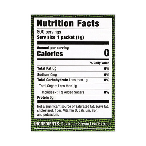 Enjoy your sweet moments naturally with Stevia In The Raw®, a 100% natural, zero-calorie sweetener. It's a natural extract from the sweet leaves of the stevia plant. The delicious flavor comes without any calories. So go on, sweeten your tea, or your coffee.Note: This is a non-returnable item.