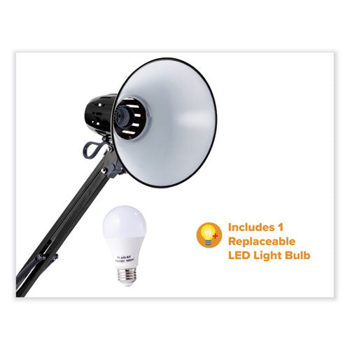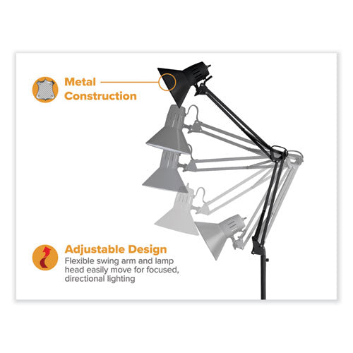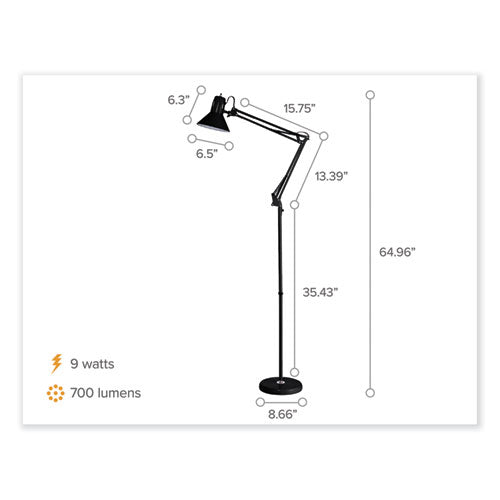 This Bostitch® Swing Arm Floor Lamp takes floor lamps to new heights. Featuring a 72-inch height, this floor lamp is perfect for home, home office, living rooms and communal office space. Easily raise and adjust the moveable multi-joint arm to control the flicker-free light zone that is produced by the bright 9 W LED light bulb.Note: This is a non-returnable item.