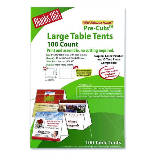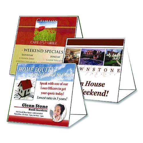 Create an upstanding impression with digital table tents. Crisp folds along the score lines and interlocking tabs make this sturdy product stand up. These digital table tents are designed for printing on digital equipment. Print one sheet at a time, or multiple and take advantage of the pre-micro-perforated sheets which make the table tents easy to separate.