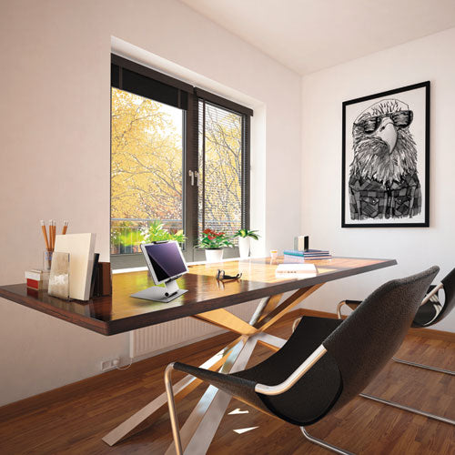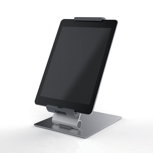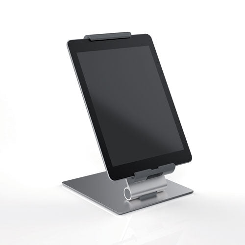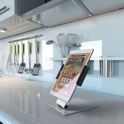 This premium-quality desktop tablet holder is ideal for use in offices, at reception desks, and in sales and exhibition environments. With its elegant surfaces and excellent stability, the desktop tablet holder is a great resource for presentations. Compatible with 7" to 13" tablets, opening in the support arm allows for easy connection to power supply, and offers 360° rotation that allows you to use the tablet in portrait or landscape mode. Use the special key to lock the holder in place for worry-free use you can depend on.Package Includes: Key