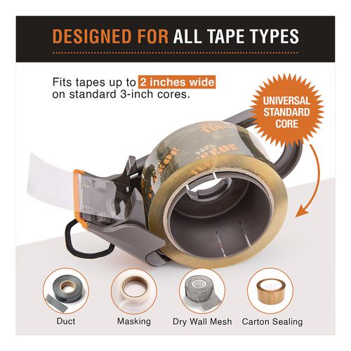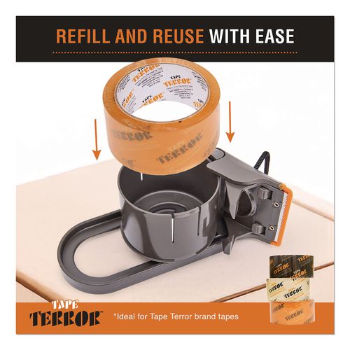 The Tape Terror™ Dispenser is the ultimate solution for simplifying your packing tasks. Designed with a razor-sharp cutter for precise, effortless cuts, it easily handles tapes up to 2" wide on 3" cores. Perfect for carton sealing, duct work and more, this dispenser's edge-holding design ensures the tape start is always accessible, saving you time and frustration. Its durable, refillable construction is built to last, making it the ideal tool for any project, big or small. Whether you're sealing boxes or tackling repairs, the Tape Terror™ Dispenser delivers reliable performance every time.