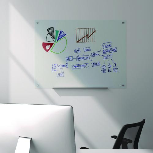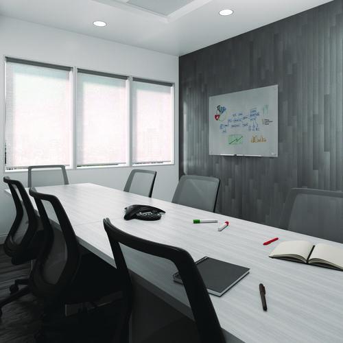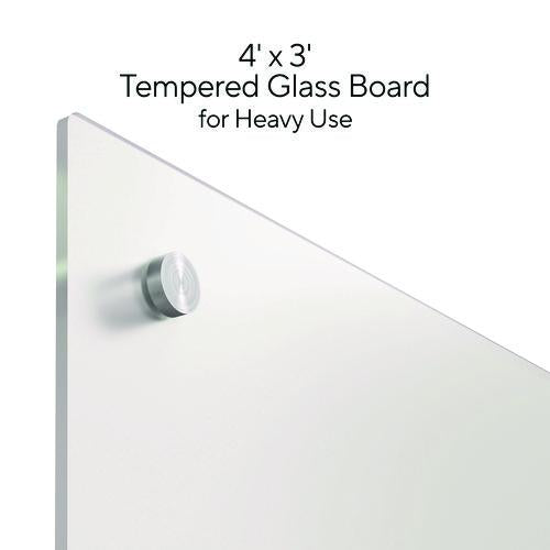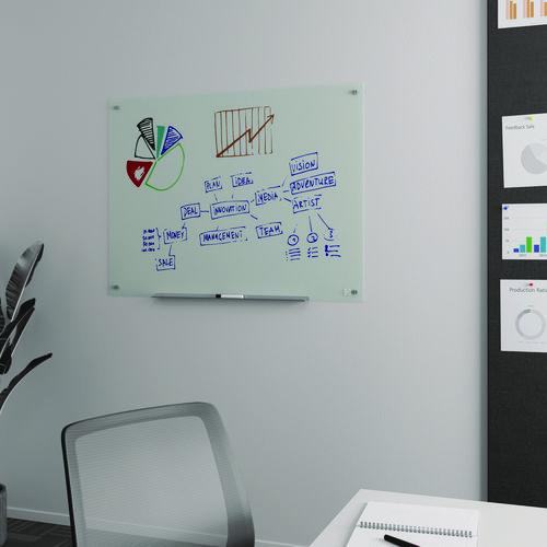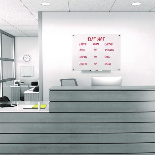 This TRU RED™ glass board features a durable tempered glass surface that resists staining and scratches, making it ideal for frequent use in high-traffic areas. This dry erase board features a large surface area perfectly sized for use in the office or the home, with an added versatility that allows vertical or horizontal placement. This board is easy-to-erase and easy-to-clean, so you can write and erase with ease. Know that those long-term ideas can stay up without worrying about leaving a permanent stain. The dry erase board kit includes an easy-to-install mounting kit and instructions, and one black dry erase marker that can be stored conveniently on the included accessory tray.Package Includes: Mounting Kit; Accessory Tray; (1) Dry Erase Marker