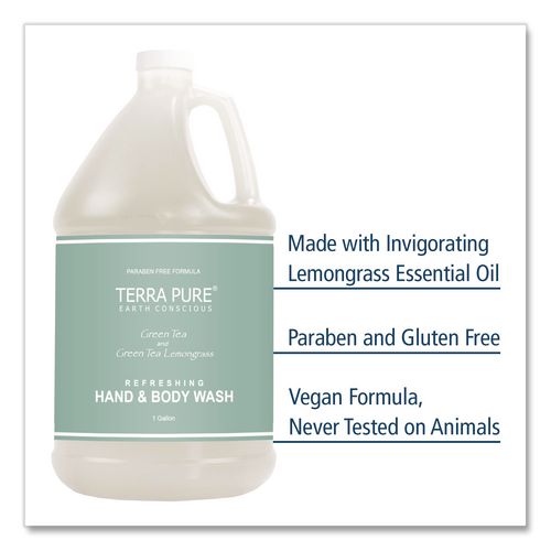 Elevate guest experience and embrace luxury and sustainability with the Terra Pure® Earth Conscious gallon collection. This premium quality hand and body wash is designed with care, and high performance. The refreshing hand and body wash delivers results guests will thoroughly enjoy with every use. Infused with the nourishing goodness of olive oil and aloe vera extract, it ensures soft, smooth and hydrated skin. The green tea and lemongrass fragrance adds an invigorating touch to guests' hygiene routine. Terra Pure® Hand & Body Wash is vegan-friendly, free from harsh chemicals, and packaged in a bottle made with recycled content. The convenient gallon bottle is designed to refill both wall-mounted and stand-alone dispensers, reducing waste and cultivating a sustainable mindset. This product is part of the EcoWell® Health and Wellbeing group, making this the perfect choice for guests.Note: This is a non-returnable item.