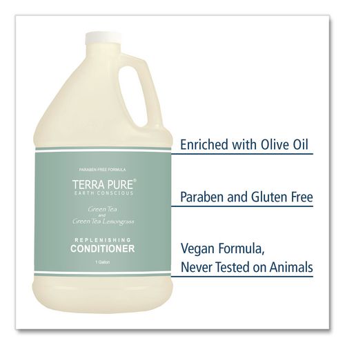 Elevate guest experience and embrace luxury and sustainability with the Terra Pure® Earth Conscious gallon collection. This salon-quality formula is a premium conditioner that delivers results guests will thoroughly enjoy with every use. Infused with the nourishing goodness of olive oil and aloe vera extract, it ensures silky-smooth, deeply hydrated and shiny hair. The subtle fragrance adds a refreshing, invigorating touch to guests' hair care routine. Terra Pure® conditioner is vegan-friendly, free from harsh chemicals, and packaged in a bottle made with recycled content. The convenient gallon bottle is designed to refill both wall-mounted and stand-alone dispensers, reducing waste and cultivating a sustainable mindset. This product is part of the EcoWell® Health and Wellbeing group, making this the perfect choice for guests.Note: This is a non-returnable item.