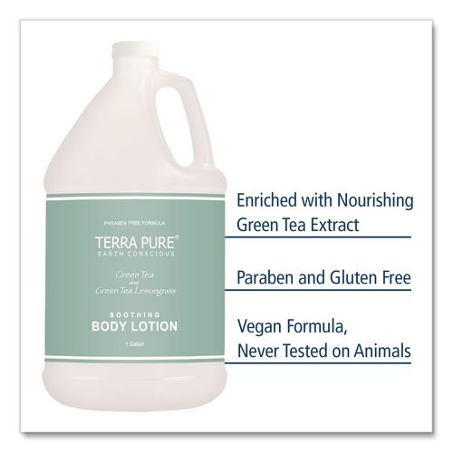 Elevate guest experience and embrace luxury and sustainability with the Terra Pure® gallon collection. The salon-quality body lotion is designed with care, high performance and respect for sustainability. A premium body lotion that delivers results guests will thoroughly enjoy with every use. Infused with the nourishing goodness of olive oil and aloe vera extract, it ensures soft, smooth and hydrated skin. The subtle fragrance adds a refreshing, invigorating touch to guests' skin care routine. Terra Pure® body lotion is vegan-friendly, free from harsh chemicals, and packaged in a bottle made with recycled content. The convenient gallon bottle is designed to refill both wall-mounted and stand-alone dispensers, reducing waste and cultivating a sustainable mindset. This product is part of the EcoWell® Health and Wellbeing group, making this the perfect choice for guests.Note: This is a non-returnable item.