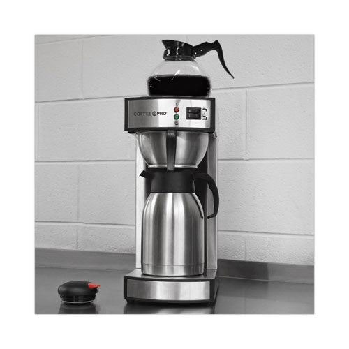 12-cup capacity. Includes thermal carafe, upper warmer and independent controls. Designed for fresh water pour-over. Features high energy efficiency and quick brew cycles. Grounded cord with three-prong plug.Note: This is a non-returnable item.