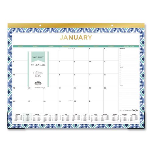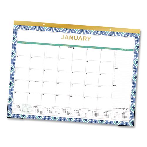This crisp geometric-patterned desk pad calendar helps you view your day and month at a glance. Featuring green and blue artwork with gold foil features. The calendar features generously sized daily blocks for multiple entries and lists all major holidays. Stay organized with the side column which provides space for notes and a Project and To-Do checklist. A reference calendar with 13 past/future months is included on each page. A sturdy backboard provides a cushioned writing surface, and clear corner protectors keep pages flat. The paper is premium-quality and acid-free, minimizing potential ink bleed-through.Note: This is a non-returnable item.