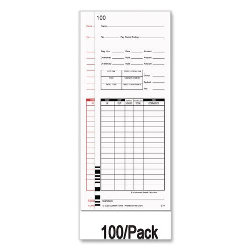 Record daily details precisely with these time cards designed for use with Lathem 7000E and 7500E time clocks. Made with heavy-duty stock, these cards are perfect for industrial, food service, or general office applications. Featuring black print on the front side and red on the back to ensure correct use, these Lathem time cards are numbered and bar coded to make record-keeping easy. Spots for recording time are easy to read as the time clock imprints text in precise areas. Columns show exactly when an employee clocked in and out during the pay period, while places for a name, signature and pay amount are clearly marked outside of the stamped areas. These time cards work for weekly, biweekly and semimonthly time periods