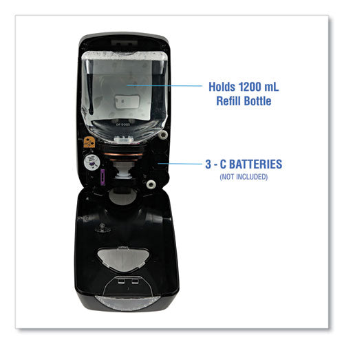 Touch-free, trouble-free dispensing system allows for easy access to soap for your patrons. Holds a large, 1200 mL refill, for long-lasting service with fewer refills. Dispenser features a skylight and a sight window, which make it easy to see when it's time for a refill. Uses three C alkaline batteries (not included)