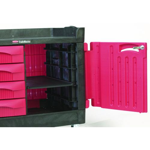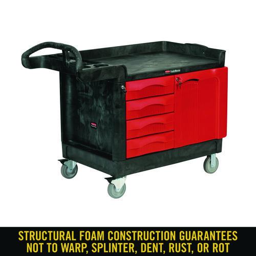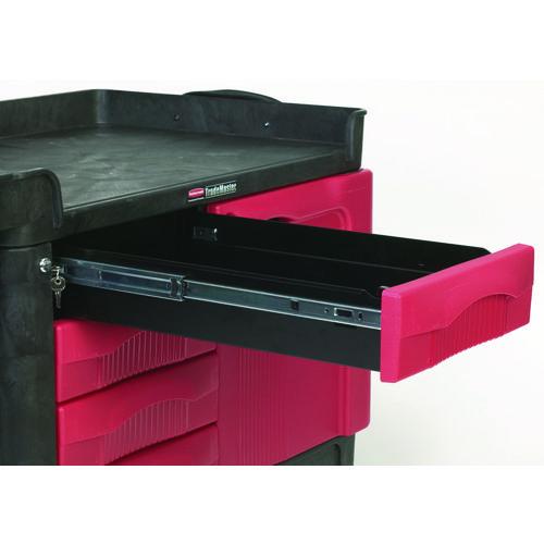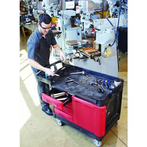 The Rubbermaid Commercial TradeMaster Utility Cart easily transport tools and supplies where you need them. The utility cart is made from a durable structural foam construction. The rolling utility cart is low maintenance, and rust, dent, and chip resistant. These utility carts feature a comfort grip, user-friendly handle and molded-in compartments for small parts or tools. The utility cart includes 5-inch non-marking casters, 2 fixed and 2 swivel with total lock brakes and full-extension, ball bearing drawer slides. Single key lock secures all drawers and allows one drawer to open at a time.