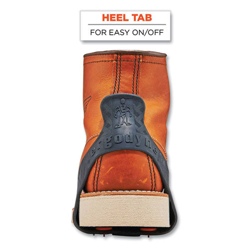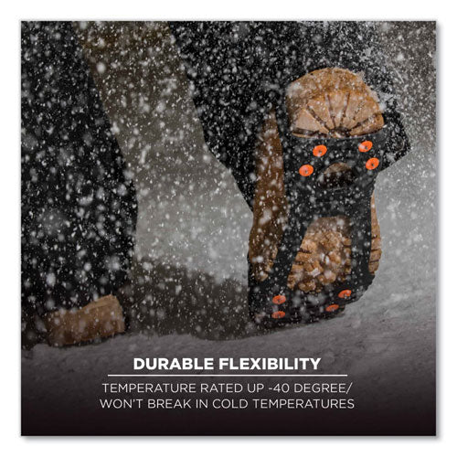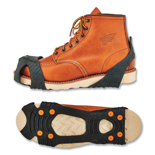 The TREX 6300TC Tungsten Carbide Slip-On Ice Cleats are lightweight ice grips for boots and shoes that provide tenacious traction and extra stability on ice and snow. One-piece design offers grip to prevent slip and fall injuries on the ice. These ice grippers feature eight rugged tungsten carbide cleats on the ball and heel of foot for extra-firm grip on slippery terrain. Tungsten Carbide is a very hard compound. It rates 9 on the Mohs scale for hardness, second only to a diamond. Because it is so hard, the spike can be thinner, providing better penetration and sharper grip. These will fit over any style of boot or shoe for traction and stability during winter work or other winter outdoor activities. Tested to be flexible in temperatures down to -40°F (-40°C), the stretchable rubber material provides a secure fit and easy slip on/off wear. These snow cleats are lightweight and can be folded small enough to be stored in a pocket or pack when not being worn.Note: This is a non-returnable item.