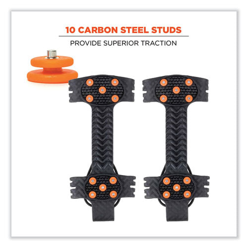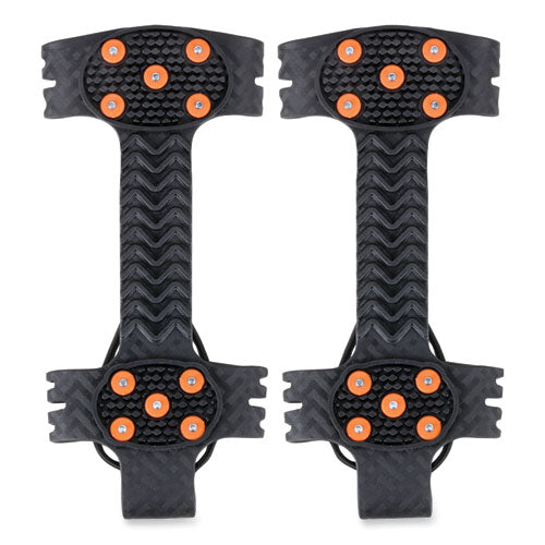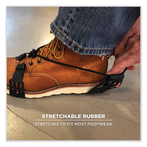 The TREX 6310 Adjustable Slip-On Ice Cleats are lightweight ice grips for boots and shoes that provide tenacious traction and extra stability on ice and snow. Stretchable one-piece design offers grip to prevent slip and fall injuries on the ice. These ice grippers feature 10 rugged carbon steel cleats on the ball and heel of foot for grip on slippery terrain. Aggressive trade connects mid-foot and heel stud zones for extra traction. Available in multiple sizes and will fit over any style of boot or shoe for traction and stability during winter work or other winter outdoor activities. Tested to be flexible in temperatures down to -40°F (-40°C), the stretchable rubber material provides a secure fit and easy slip-on/off wear. An adjustable cord cinches tight for a secure fit. Reflective pull-on tab on these ice traction cleats adds enhanced visibility. These snow cleats are lightweight and can be folded small enough to be stored in a pocket or pack when not being worn.Note: This is a non-returnable item.
