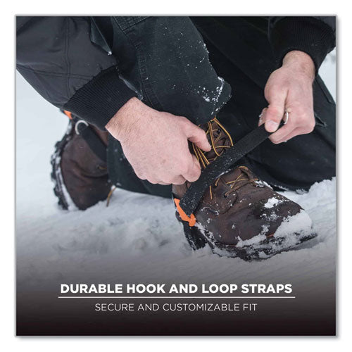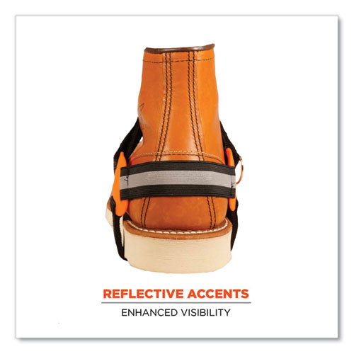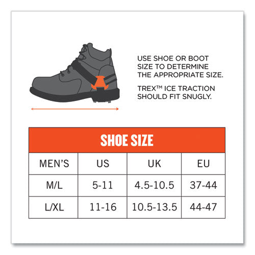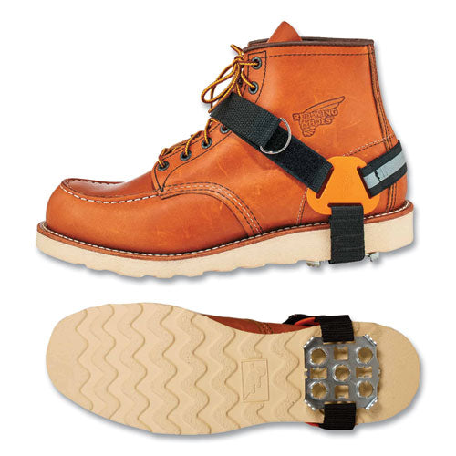 The TREX 6315 Strap-On Heel Traction Cleats are ice grips for boots and shoes with rugged steel plates that turn boot heels into ice picks, leaving the mid-foot free for vehicle operation. Ice traction cleats help save money while preventing slip and fall injuries. These ice grips for boots provide the best in class all-direction traction on ice and snow during the winter months while leaving the toe and mid-foot free. These will fit on the heel of any boot or shoe. Durable webbing with hook & loop strap provides a secure fit and stability for winter work or recreation. Material is lightweight and is small enough to be stored in a pocket or pack when not being worn. Rear reflective accents help make wearers more visible in dark environments. These should fit snugly on your boot or shoe. Use your shoe/boot size to determine the approximate size.Note: This is a non-returnable item.