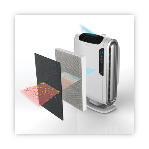 True HEPA filter captures 99.97% of airborne particles as small as 0.3 microns, including pollen, ragweed and other allergens, viruses, germs, dust mites, mold spores and odors. AeraSafe™ antimicrobial treatment provides built-in protection from the growth of odor-causing bacteria, mildew and fungi on the filter. Compatible with AeraMax® Air Purifiers.
