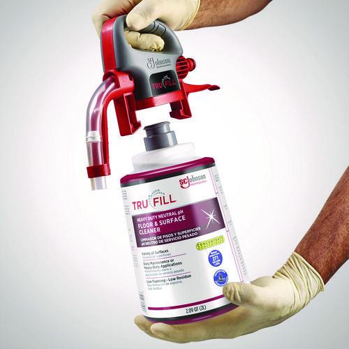 Take dilution control off the wall with the TruFill Dispensing System. TruFill offers easy-to-use, quick-change cartridges that automatically blend concentrates with water to provide worry-free dilution. The rugged design easily attaches to buckets and auto scrubbers for simplified dilution mixing into these high-volume vessels. The TruFill hose (sold separately) attaches easily to the dispenser with a quick-connect adapter (sold separately), and the twist-lock design securely attaches the dispenser head to the no-spill 2 L concentrate cartridge, creating a system that delivers up diluted solution.Package Includes: (2) 2 L Cartridges; (1) Dispenser HeadNote: This is a non-returnable item.