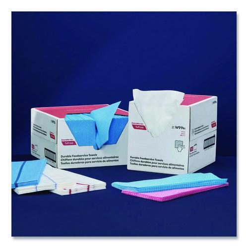 Foodservice towels are designed to replace rental linen or cloth dish towels. Every towel is durable, absorbent, reusable and can be used in virtually any surface cleaning application. Towels will not breakdown in sanitizing or disinfection solutions. Color-coded towel system is designed to help eliminate the risks of cross-contamination. Space-saving case allows for easy dispensing. Durable enough for all foodservice wiping needs from the front of the house to the back of the house.
