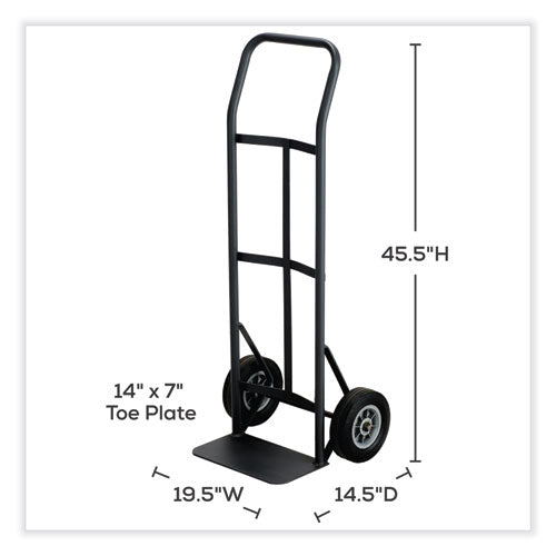Ideal for one or two-handed use. The heavy gauge, tubular steel frame with welded joints and black powder coat finish ensures durability. The material rests on a 14 x 7 toe plate and is mobile on 8 solid rubber casters with ball bearings. The hand truck is rated up to 400 lbs. weight capacity and is shipped fully assembled.Note: This is a non-returnable item.