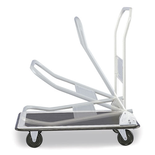 The Tuff Truck™ Platform Truck is a gray dolly with an all-welded steel frame with an anti-skid platform. A 3/4 wrap-around vinyl bumper helps protect doors and furniture, and a chip-resistant light gray powder coat finish with black vinyl trim ensures cart durability. The cart offers a folding handle for compact storage. Mobile cart on 4 wheels (two swivel). Truck assembly required.Note: This is a non-returnable item.