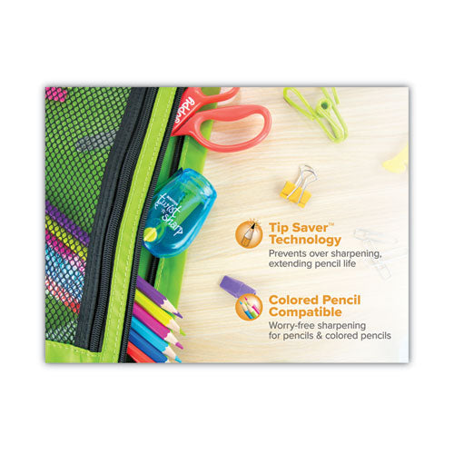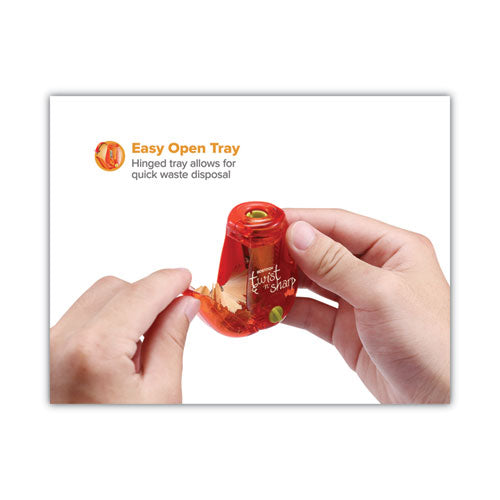 Twist-n-sharp two-hole pencil sharpener features ratchet technology in the sharpener for easy sharpening. The ratchet allows for faster sharpening without ever having to let go of the pencil. This technology is only offered on stitch premium office supplies. This sharpener also offers the convenience of two different sized holes so you can sharpen standard pencils as well as jumbo pencils!