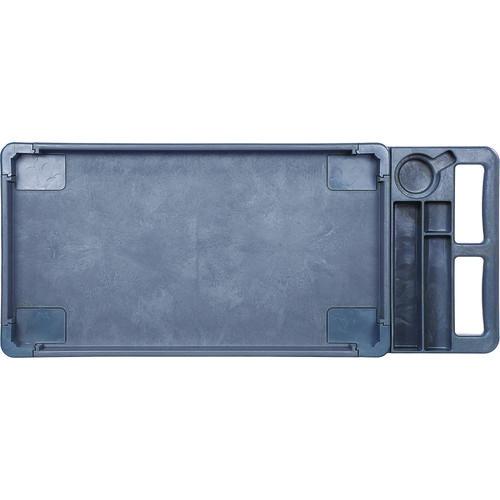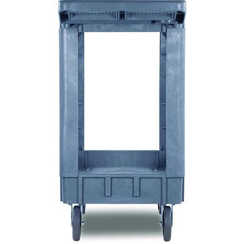 Durable polypropylene construction, gray, two-shelf utility cart with casters. Molded-in plastic handle allows for easy steering on the go. The handle and raised top rim are great for hanging cleaning products and supplies to tackle cleaning jobs from one room to the next.