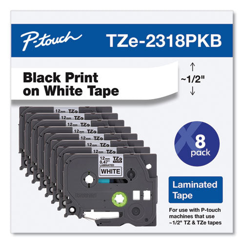 TZe Series Standard Adhesive Laminated Labeling Tape, 0.5", Black on White, 8/Pack