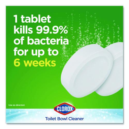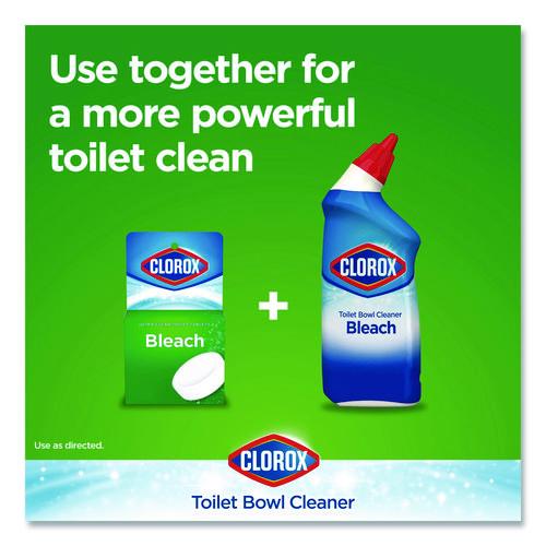 Clorox® Ultra Clean Toilet Tablets kill 99.9% of bacteria and deodorizes your toilet with the power of Clorox® bleach. This toilet bowl cleaning tablet, effectively cleans and prevents stains with each flush, eliminating the need to scrub every time. Each tablet delivers a long-lasting bleach clean and is good for up to three months. Simply drop a tablet into your toilet tank to continuously sanitize, deodorize and clean your toilet every time you flush. The dissolvable cleaning tablets help prevent tough stains and removes hard water, mineral deposits and limescale stains. Ideal for use in restaurants, cafeterias, offices, hotels, daycares and other commercial facilities. Keep your toilet bowl sparkling fresh and ultra clean with no mess and no fuss with the help of Clorox® Ultra Clean Toilet Tablets.Package Includes: Includes six packs of two tablets eachs