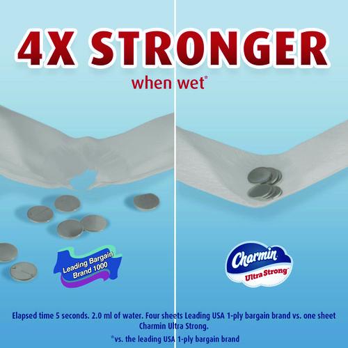 Get sparkly clean with Charmin Ultra Strong. It's four times stronger when wet and has a diamond weave texture. It's woven like a washcloth and it holds up when you wipe. It even cleans better so you can use less and go longer without changing the roll. Larger rolls mean more bang for your behind so you'll be running back to the store less and less (based on number of sheets in Charmin Regular Roll bath tissue). Our Charmin Ultra Strong toilet paper is also two-ply and is designed to be clog-safe and septic-safe so you can flush confidentially and keep clean. We all go, why not Enjoy the Go with America's favorite toilet paper.