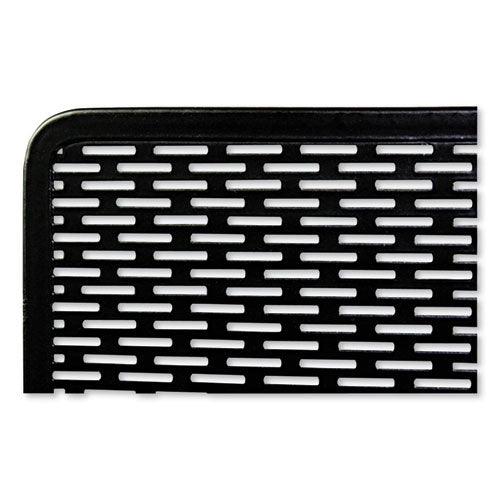 Strong, professional grade punched metal with decorative urban style slotted pattern. High quality satin finish complements any décor. Features protective feet to prevent wear and scratches on the desktop surface. Reinforced rounded edges provide durability and attractive detailing. Securely displays and organizes magazines, catalogs or other reference materials, keeping them within reach. Front panel provides base protection so the contents won't fall out.